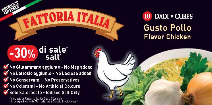 E PARLANDO DI DADI NON POTEVA DI CERTO MANCARE FATTORIA ITALIA UN'AZIENDA CHE PRODUCE DADI FIN DAL LONTANO 1975. FATTORIA ITALIA UNISCE ALTA QUALITA' A GUSTI UNICI,GRAZIE ANCHE ALL'INNOVATIVO SISTEMA DI PRODUZIONE ( COOL PROCESS OSSIA SISTEMA DI PRODUZIONE A FREDDO ) CHE E' IN GRADO DI PRESERVARE LA STRUTTURA ORGANOLETTICA DELLE MATERIE PRIME UTILIZZATE NELLA REALIZZAZIONE DEL DADO DONANDOVI QUALITA' E SALUTE.